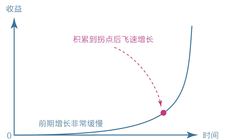 复利效应显示了价值积累的普遍规律:前期增长非常缓慢,但到达一个拐点后会飞速增长。