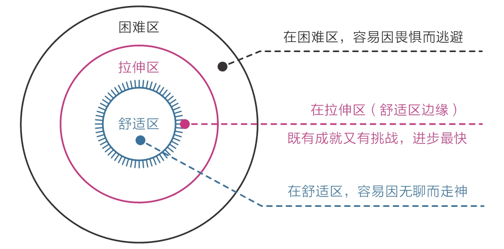 舒适区边缘另一个重要的规律是它揭示了能力成长的普遍法则:无论个体还是群体,其能力都以“舒适区—拉伸区[插图]—困难区”的形式分布,要想让自己高效成长,必须让自己始终处于舒适区的边缘,贸然跨到困难区会让自己受挫,而始终停留在舒适区会让自己停滞(见图1-1)。