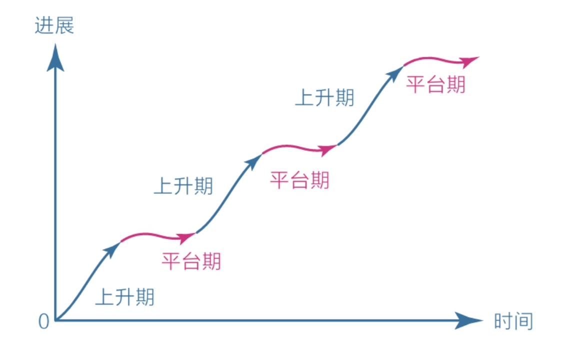 学习进展和时间的关系并不是我们想象中的那种线性关系(学多少是多少),而是呈现一种波浪式上升曲线(见图1-3)